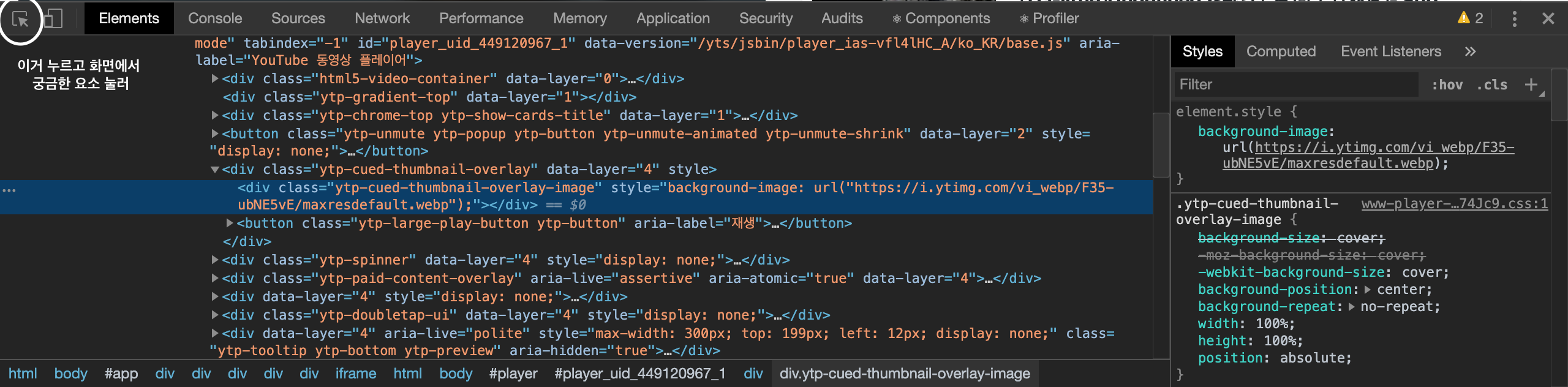 매번 엘리먼트 들어가서 하나하나 눌러가며 어떤 건지 찾았는데, 저 버튼 누르고 화면에서 움직이면 어떤 요소인지 알려준다. 감동! 핵 편해🧚🏻♀️